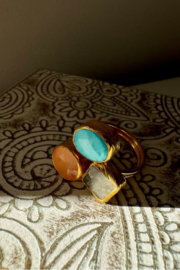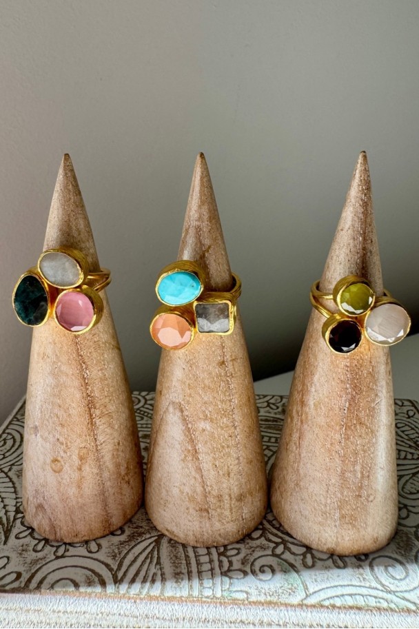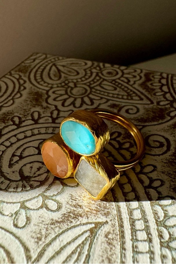 Descubre la elegancia atemporal de nuestro anillo de bronce con tres piedras naturales cuidadosamente engarzadas en un diseño artesanal único. Cada gema, una fusión armoniosa de tonos cálidos y sofisticados, realza tu estilo con un toque de distinción y exclusividad.