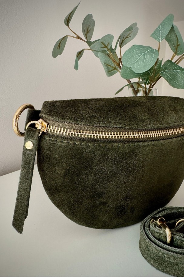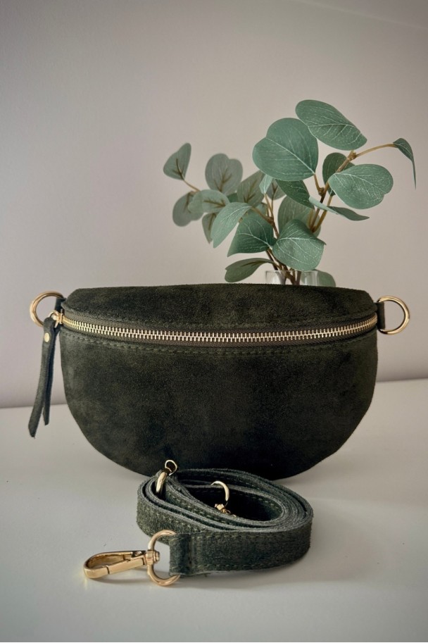 Descubre la bandolera perfecta para esta temporada de otoño, en un elegante y sofisticado tono verde musgo. Su suave acabado en ante y los detalles en dorado hacen de este accesorio un imprescindible para tus looks más cálidos y naturales.