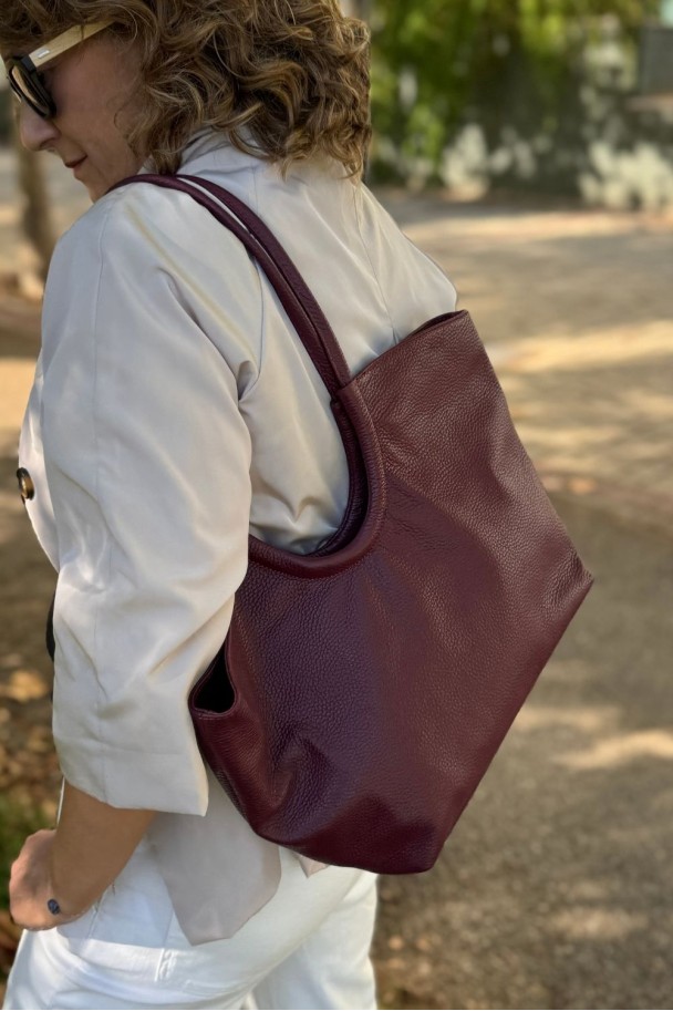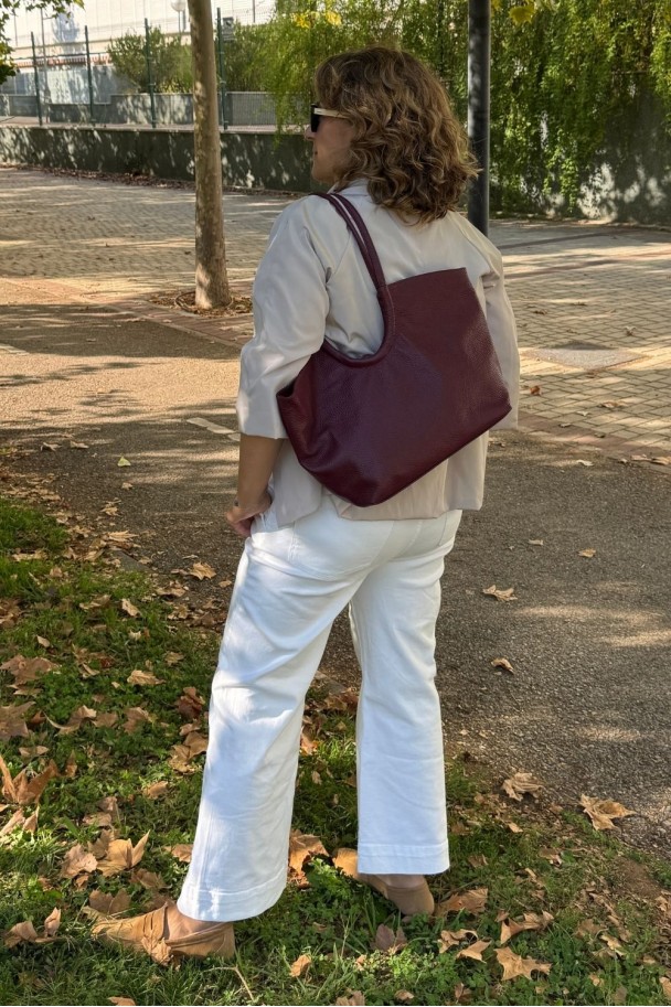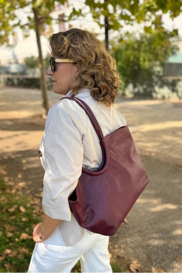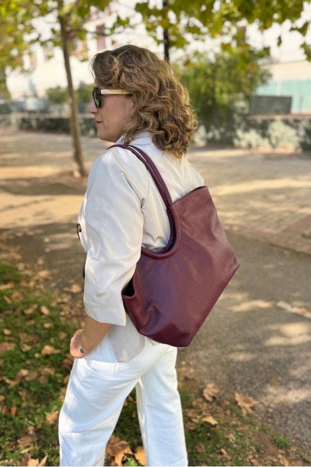 Este bolso de piel granate es el compañero perfecto para la mujer moderna, elegante y práctica. Su diseño amplio y funcional te permite llevar todo lo que necesitas sin renunciar al estilo. Fabricado en piel 100% natural, destaca por su color granate intenso, sofisticado y fácil de combinar con cualquier look.