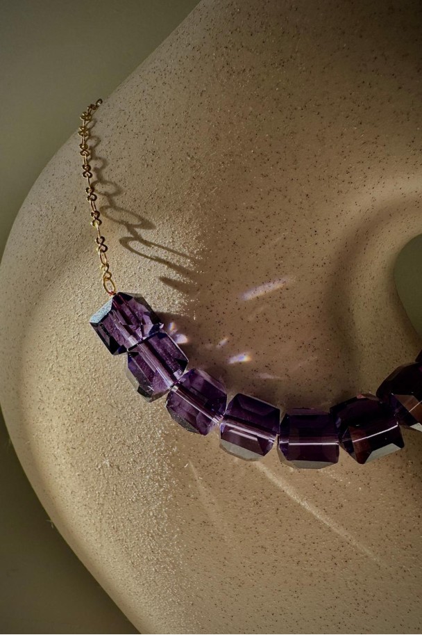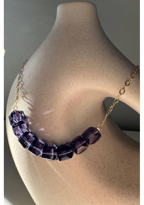 Descubre la sofisticación en cada detalle con este impresionante collar de cristales en tonos amatistas. Sus piezas facetadas capturan la luz de manera mágica, destacando por su brillo y profundidad de color.