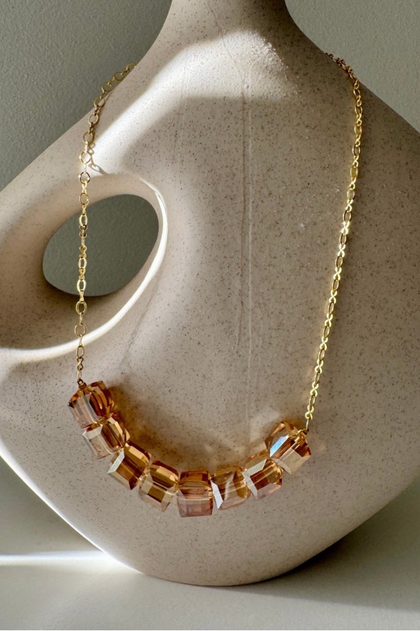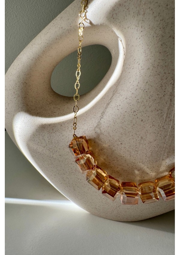 Este exquisito collar destaca por su diseño delicado y moderno. Con una cadena de eslabones dorados y un conjunto de cristales en tonos cálidos, aporta un brillo sutil y sofisticado que ilumina cualquier outfit. Ideal para ocasiones especiales o para añadir un toque elegante a tu día a día.