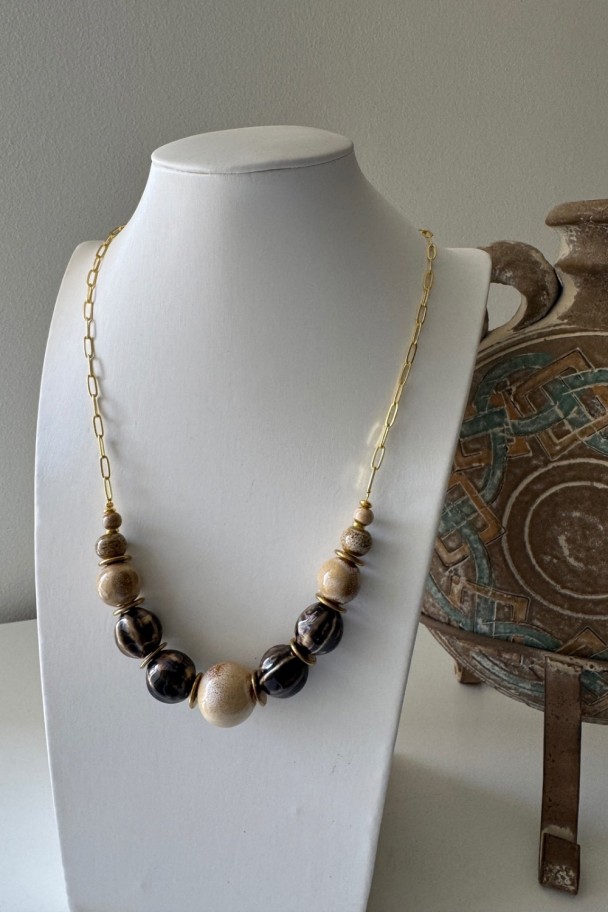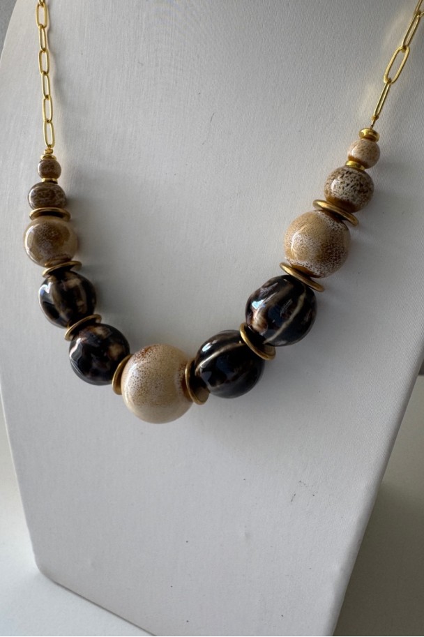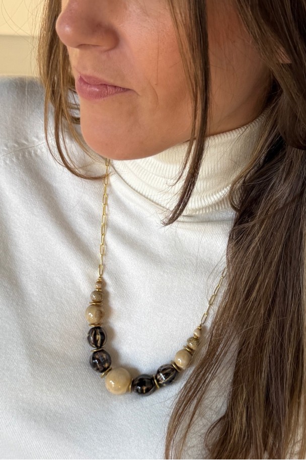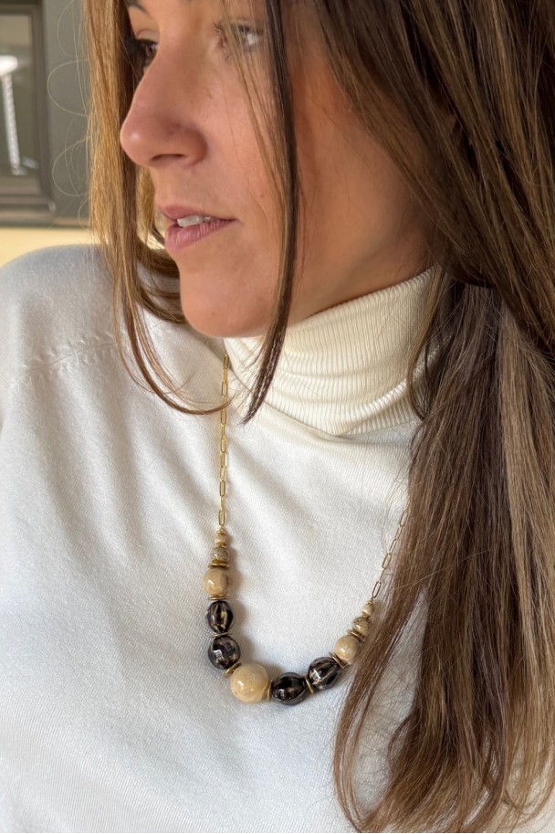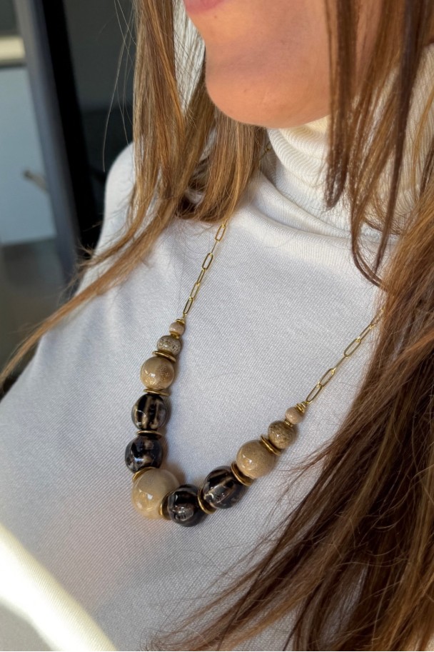 Diseñado para mujeres que buscan estilo, personalidad y elegancia sin esfuerzo, este collar combina a la perfección cuentas en tonos beige arena y negro marmoleado, creando un contraste sofisticado y muy favorecedor. La cadena dorada de eslabones alargados aporta luz al rostro y un acabado actual que eleva cualquier outfit, desde el más sencillo al más especial.