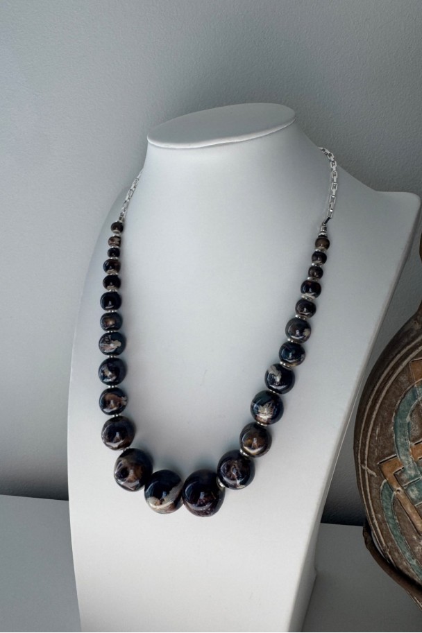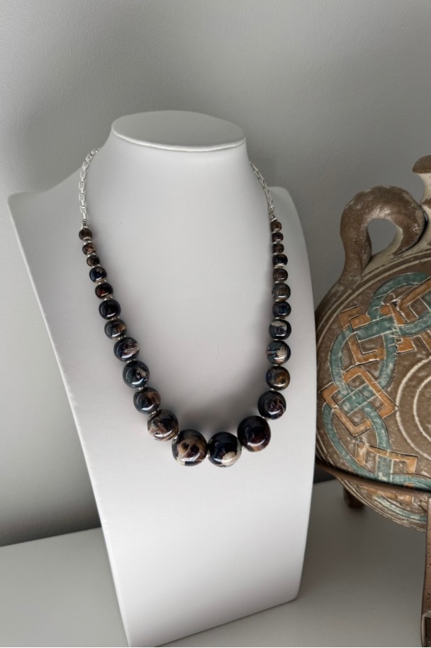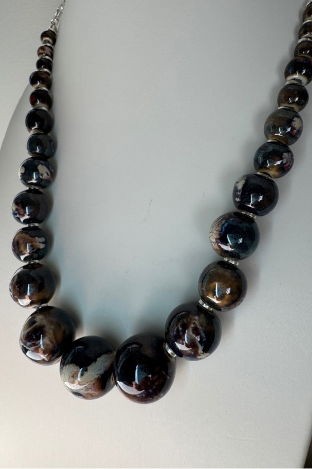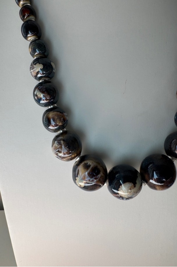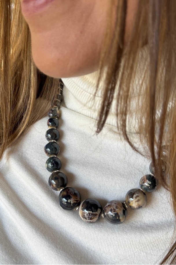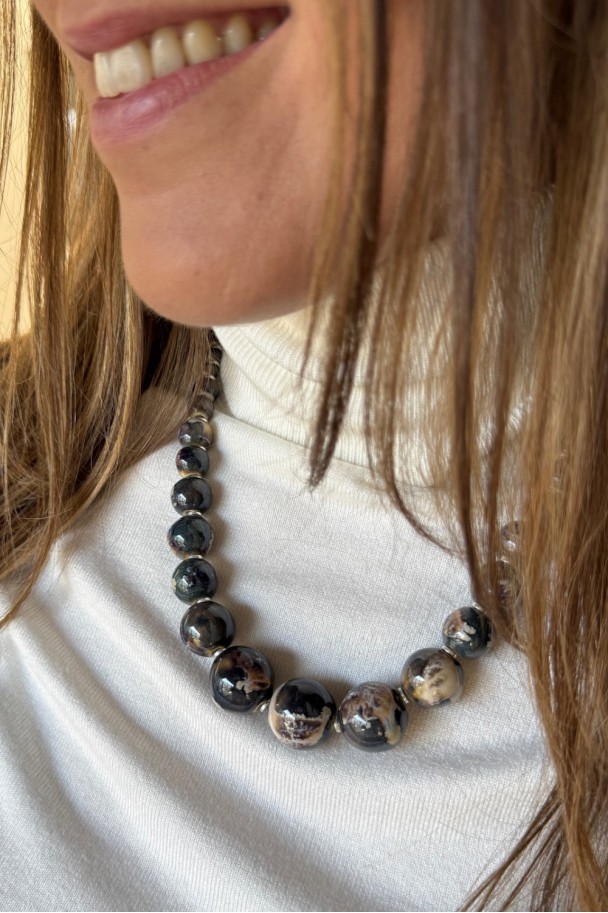 Descubre este impresionante collar de cuentas en tonos oscuros y matices marmoleados, un pieza diseñada para mujeres que buscan elegancia, fuerza y estilo en un solo accesorio.