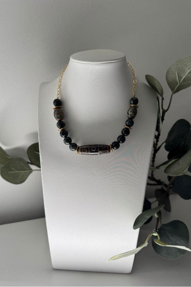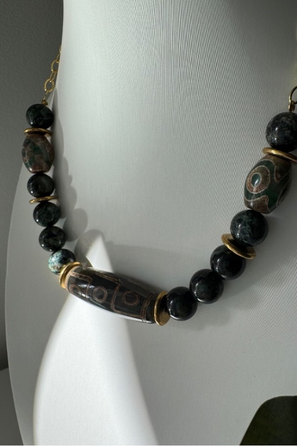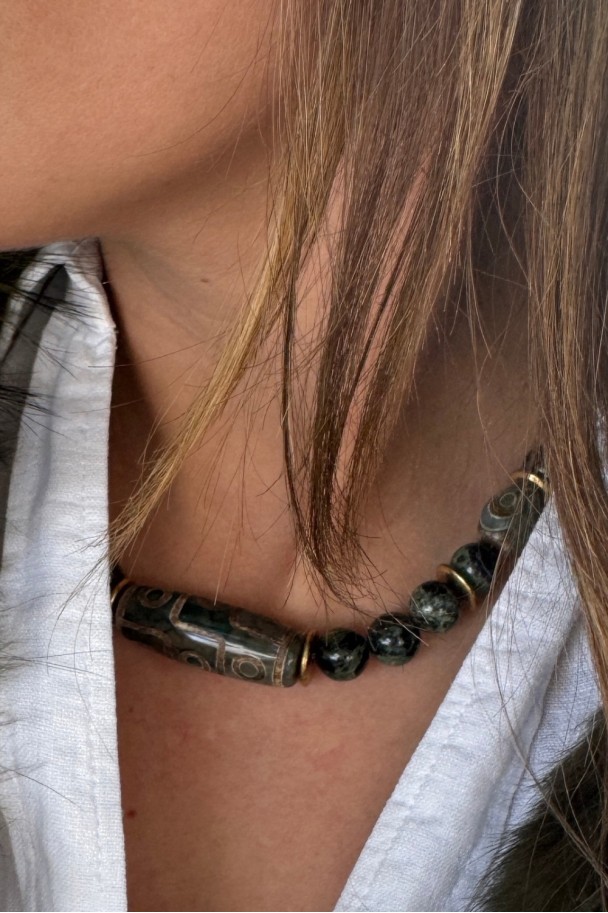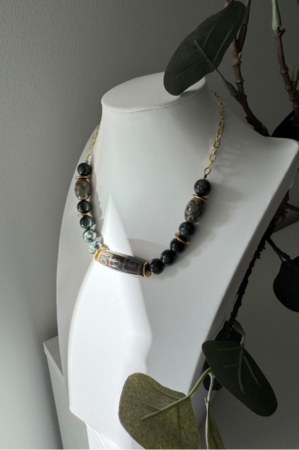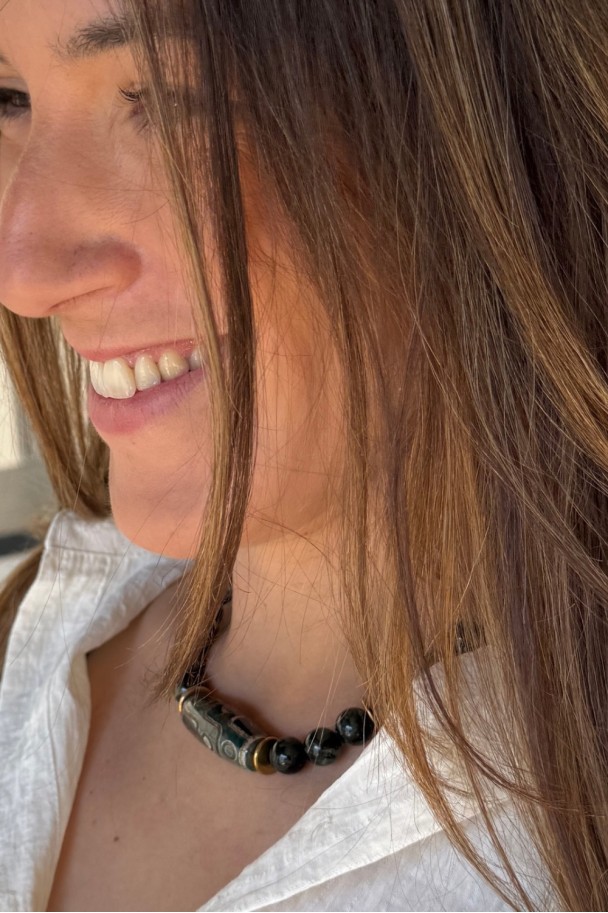 Este collar de piedras naturales en tonos verdes, es una pieza con carácter, diseñada para mujeres que buscan algo más que un complemento: buscan presencia, estilo y personalidad.