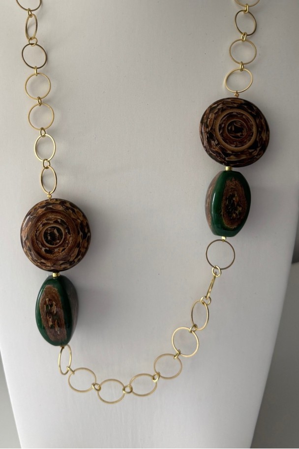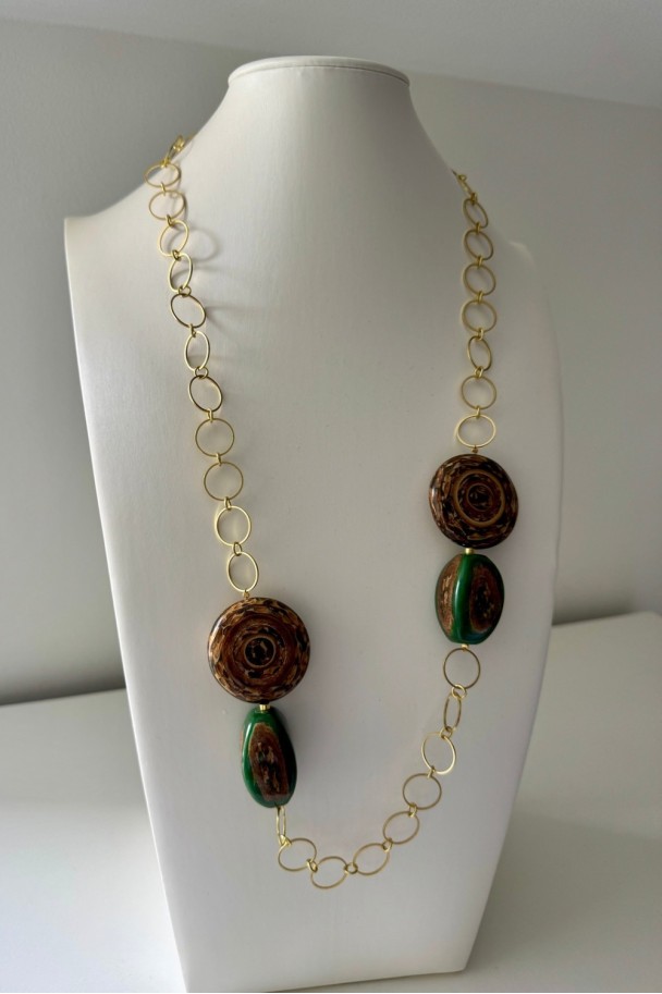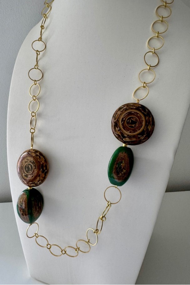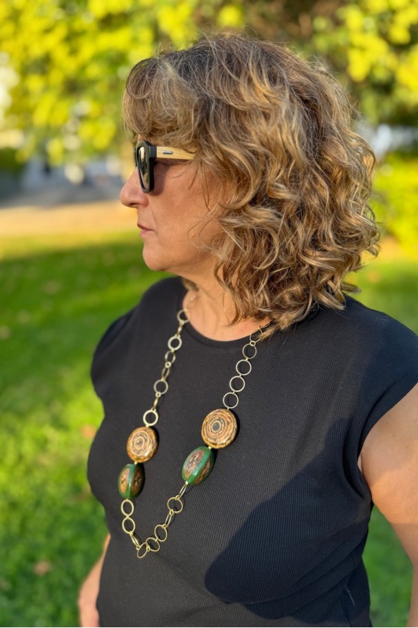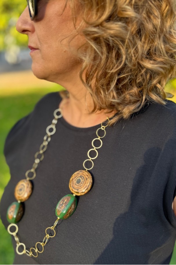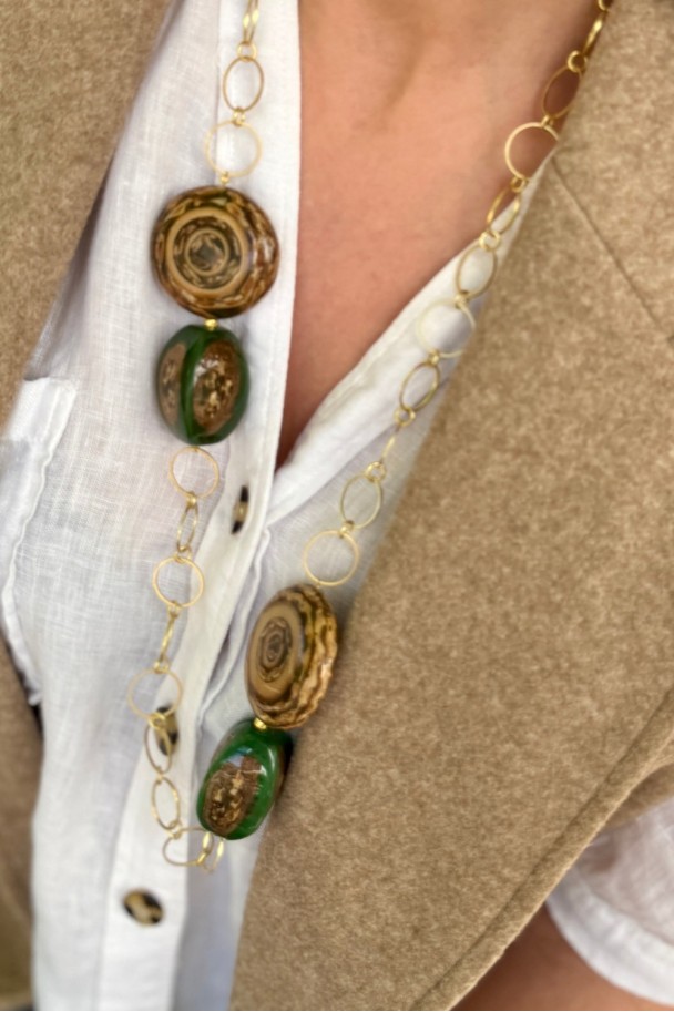 El collar de diseño artesanal que ves es una pieza que no pasa desapercibida. Su combinación de grandes cuentas en tono tierras y verdes, junto a una cadena dorada de eslabones circulares, crea un equilibrio perfecto entre elegancia y fuerza. Ideal para mujeres que aman los accesorios con personalidad, este collar se convierte en el protagonista de cualquier look, aportando un toque bohemio y sofisticado al mismo tiempo.