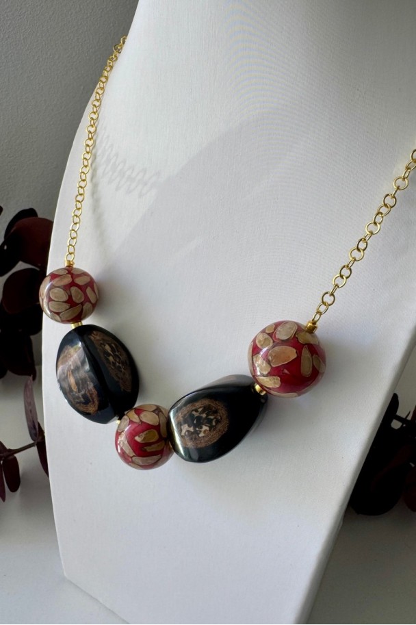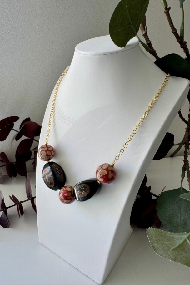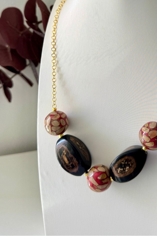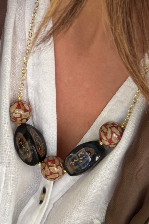 El collar Nara es una joya única que combina cuentas grandes en tonos oscuros con detalles dorados y rojizos, creando un equilibrio perfecto entre elegancia y personalidad. Su diseño artesanal y su cadena dorada ligera aportan un toque sofisticado que realza cualquier look, desde el más casual hasta el más especial.