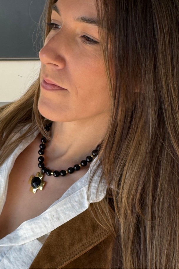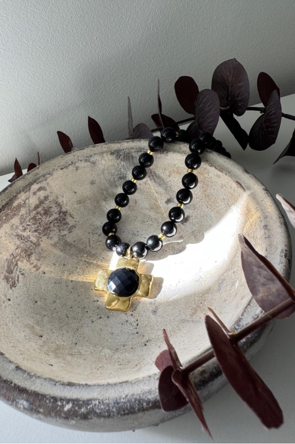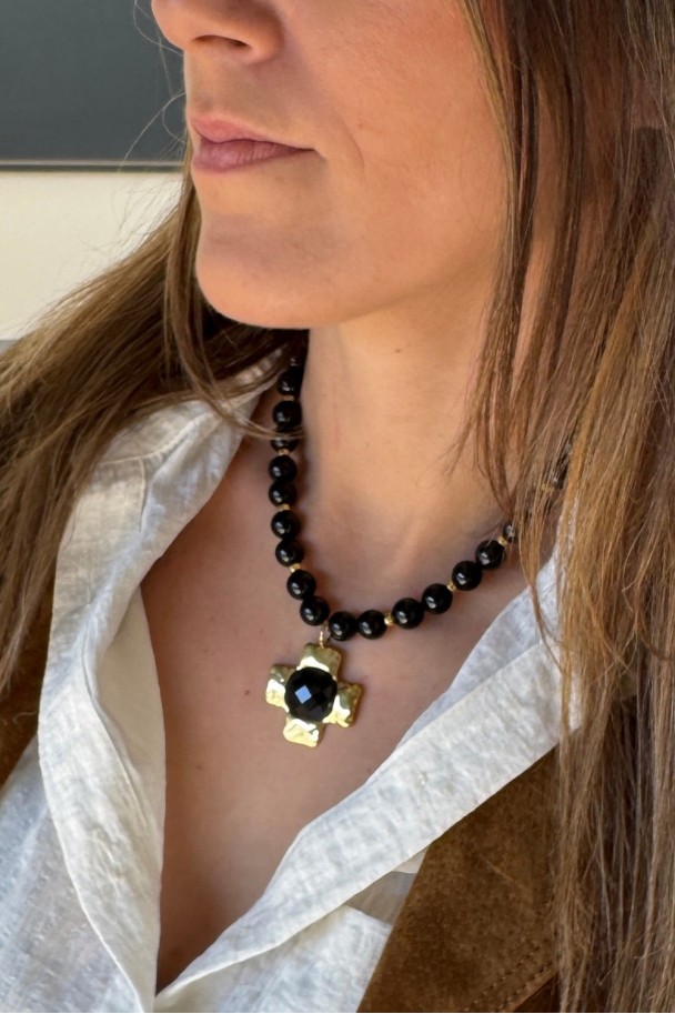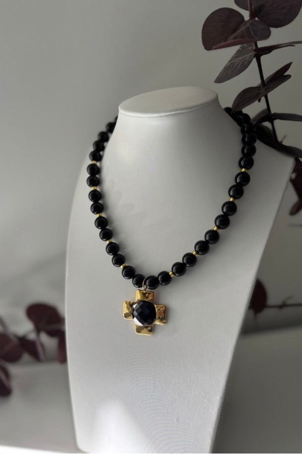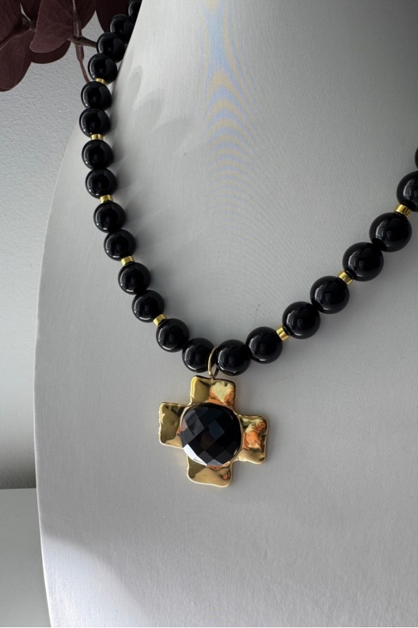 Cada cuenta de ónix negro aporta un brillo profundo y sofisticado, mientras que el colgante dorado en forma de cruz, con un centro facetado que capta la luz, se convierte en el detalle protagonista que eleva cualquier look. Su combinación de tonos negros y dorados crea un contraste irresistible, perfecto tanto para tus outfits diarios como para ocasiones especiales.