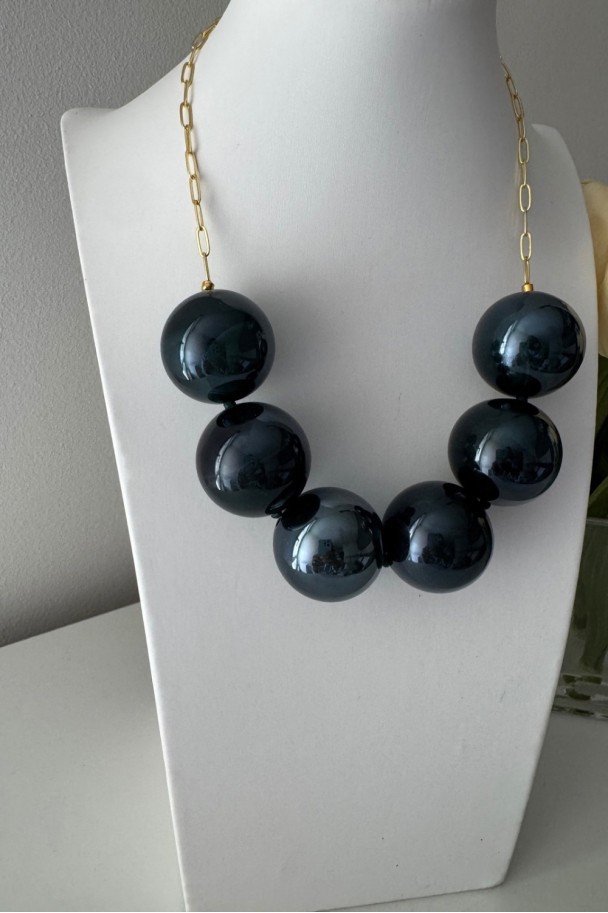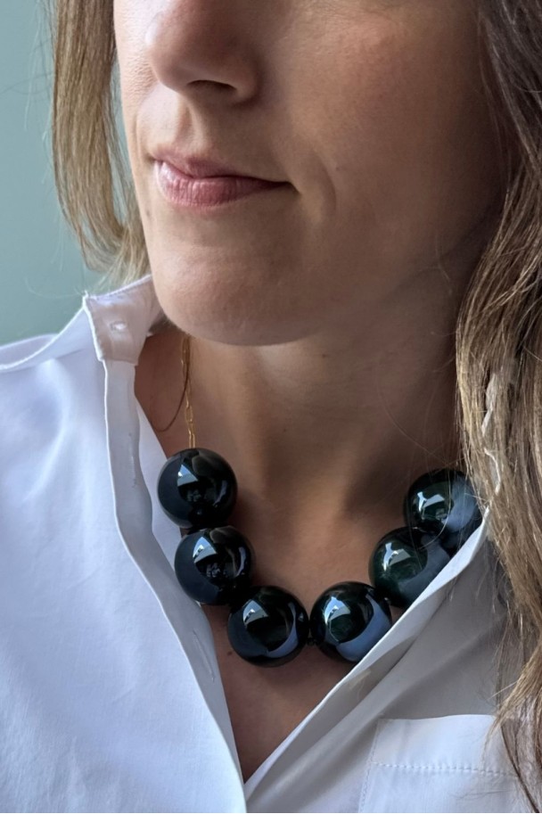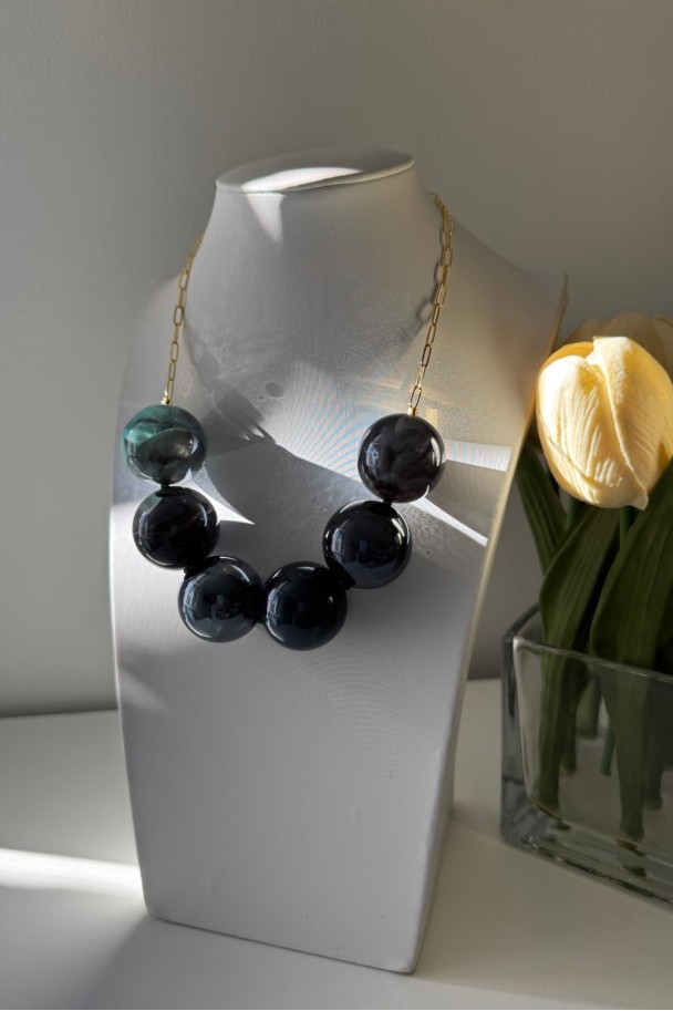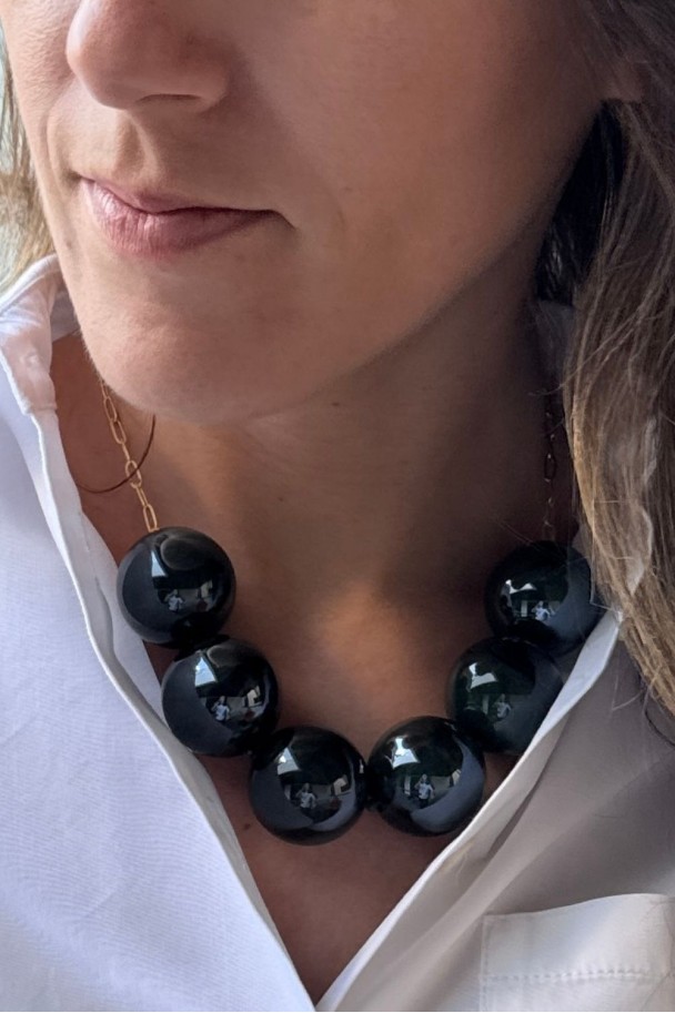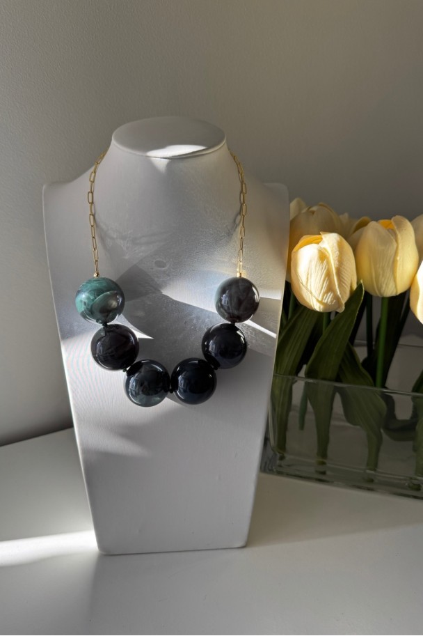 Su diseño ligero y favorecedor lo convierte en el accesorio perfecto tanto para looks diarios como para ocasiones especiales. La resina verde de alta calidad aporta un acabado luminoso y moderno, mientras que la cadena con baño de oro añade ese toque cálido y refinado que realza el escote y estiliza la figura.
