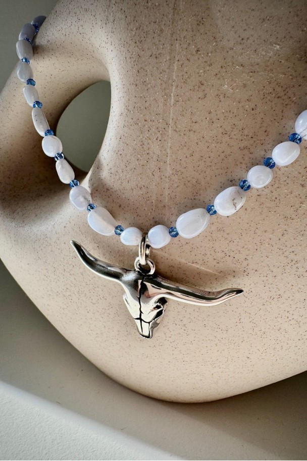 Descubre este exclusivo collar de ágatas color azul claro, diseñado para mujeres que buscan destacar con estilo. Cada cuenta de ágata resalta la serenidad de los tonos celestes, combinados perfectamente con un dije en baño de plata que aporta un aire audaz y único. Ideal para completar looks casuales o elegantes, este accesorio se convierte en el protagonista de cualquier outfit.