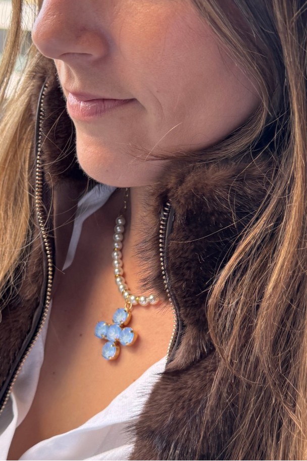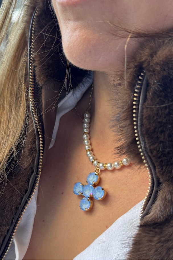 Destaca con este collar de perlas con una cruz azul cielo, una pieza que combina la sofisticación clásica con un estilo moderno y actual. Su diseño atemporal realza cualquier look, aportando un brillo sutil y un toque de color que simboliza equilibrio y serenidad.