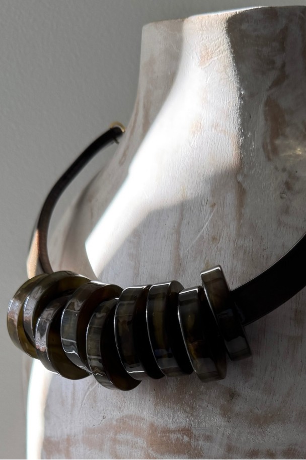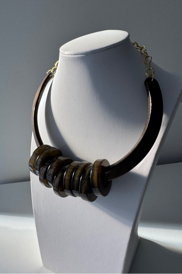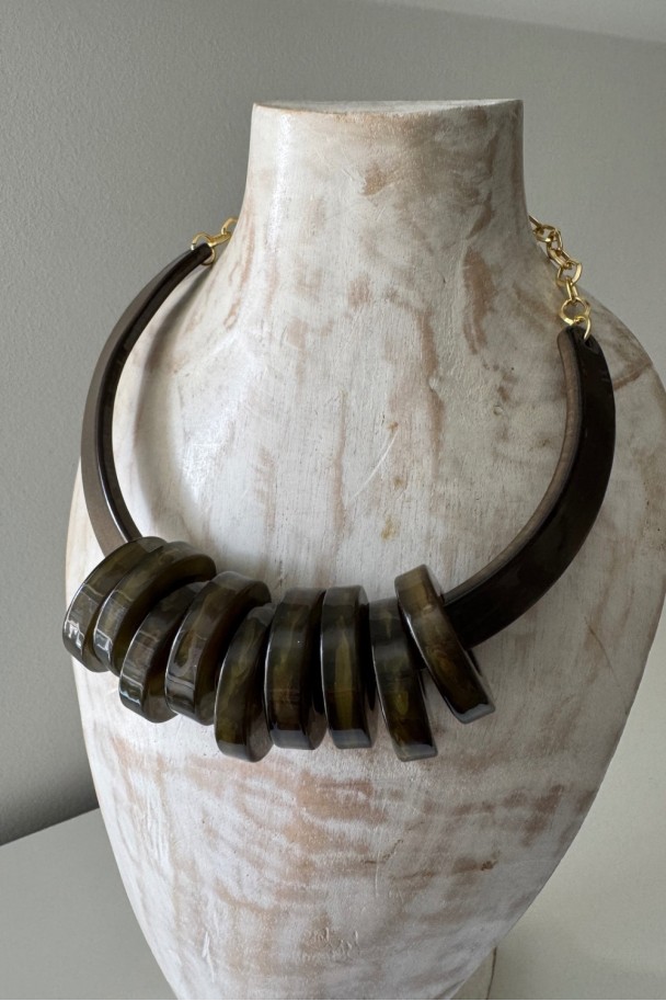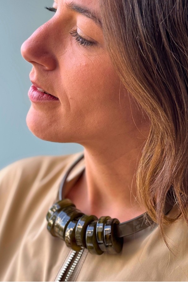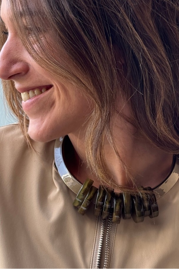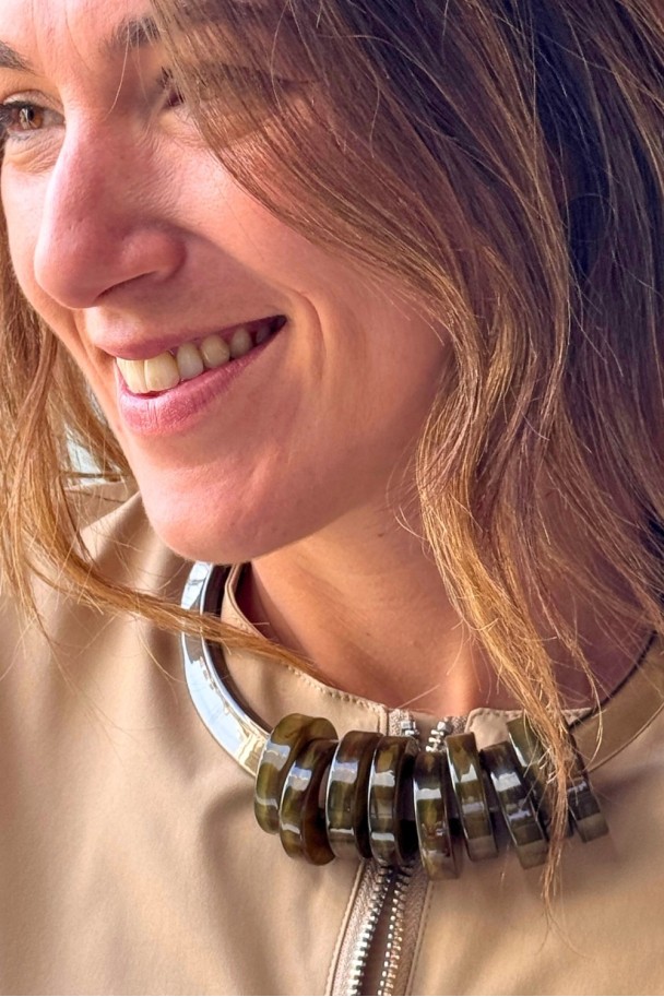 Con sus piezas circulares en tonos verdes oscuros y acabado brillante, crea un efecto visual potente, elegante y muy favorecedor. Su diseño rígido y estructurado aporta carácter, mientras que el contraste con camisas claras, vestidos lisos o prendas neutras lo convierte en el protagonista absoluto del conjunto.