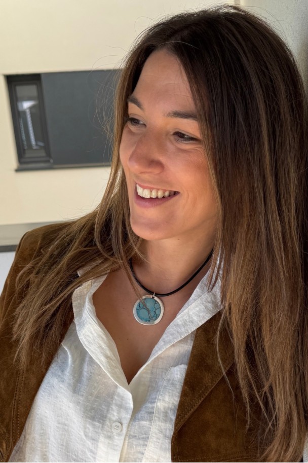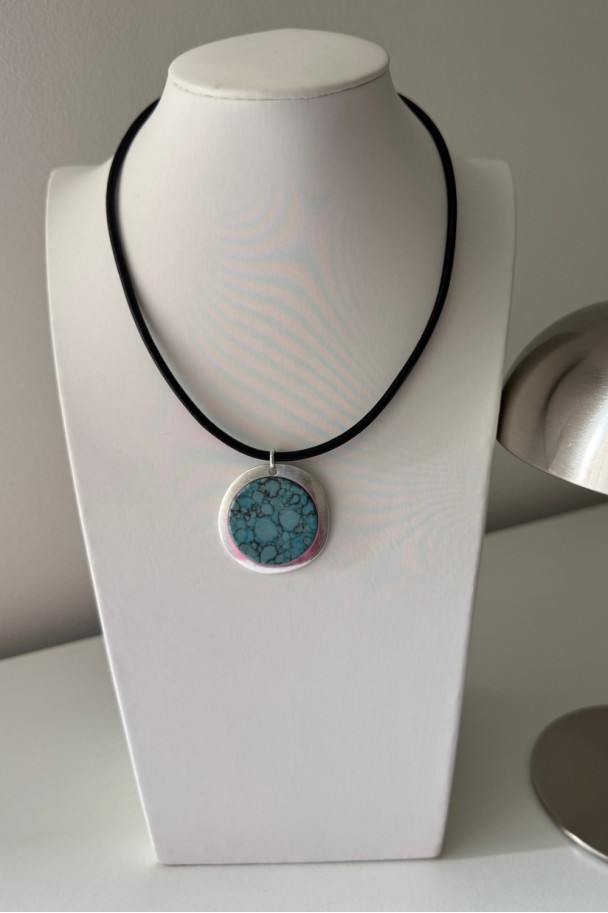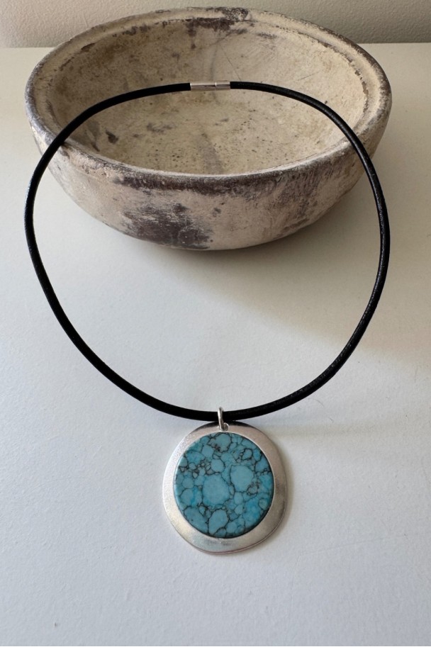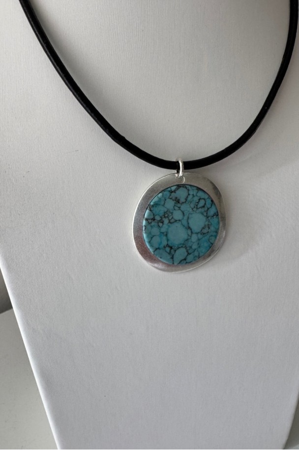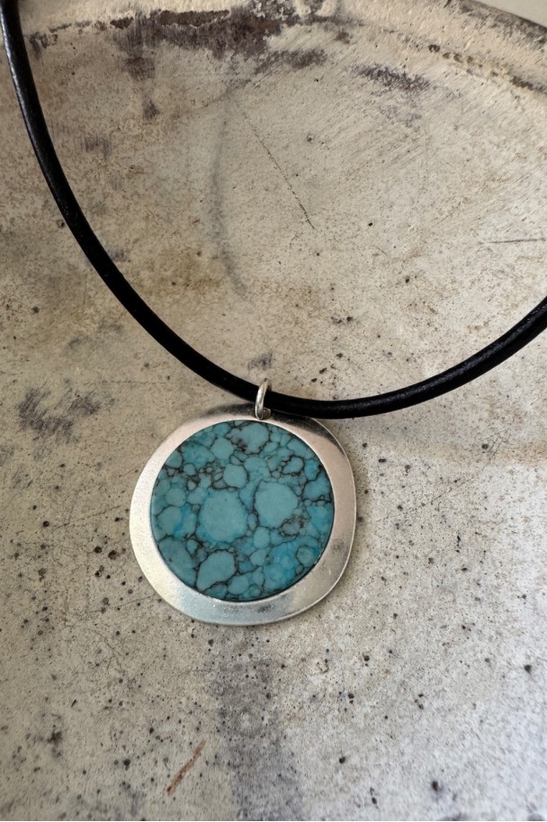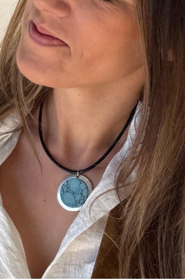 Descubre la fuerza sutil de este collar artesanal, elaborado con cordón de cuero de seda negro de acabado suave y un colgante redondo con pieza turquesa enmarcada en metal plateado. Cada veta negra en la piedra cuenta una historia, haciendo de cada pieza un diseño irrepetible.