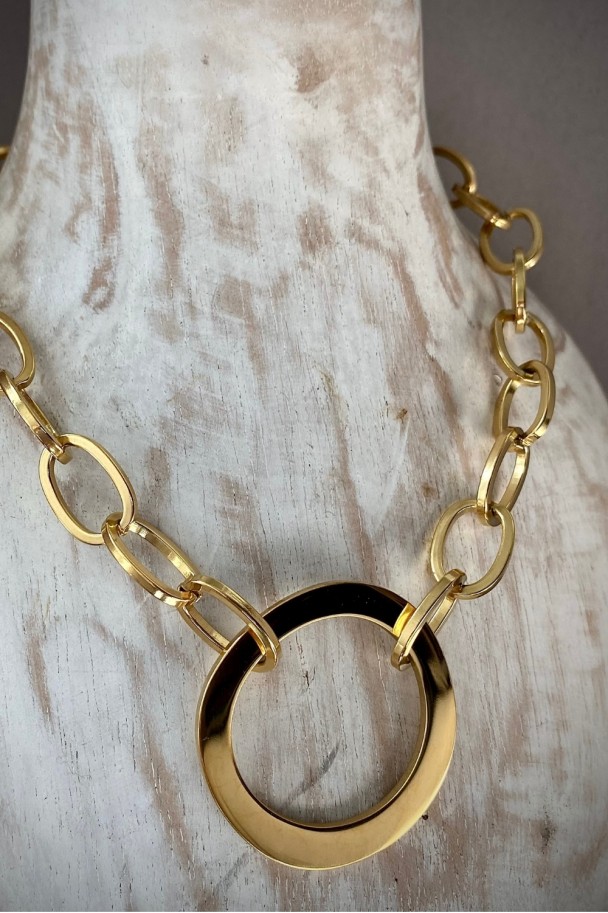 Este collar de acero dorado con eslabones grandes y colgante circular es mucha más que un accesorio, es una declaración de fuerza, estilo y sofisticación. Su diseño moderno y atemporal realza tu escote y aporta un toque de luz y distinción a cualquier outfit, desde el más casual hasta el más elegante.