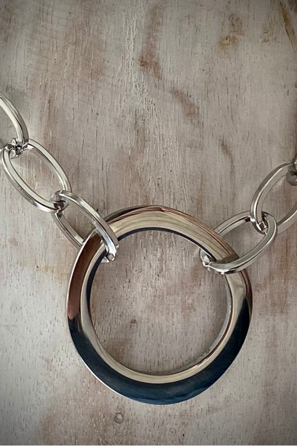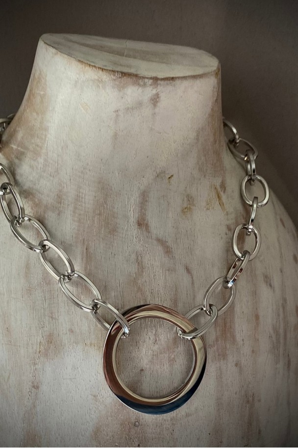 Descubre este collar de eslabones en acero plateado con colgante circular, una joya impactante que eleva cualquier look con un toque sofisticado y contemporáneo. Su diseño audaz y minimalista combina a la perfección con estilos urbanos, formales o casual chic, convirtiéndolo en el complemento ideal para mujeres que marcan tendencia.