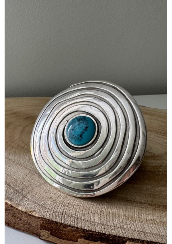 Descubre la elegancia única de esta hebilla, con diseño espiralado en metal bañado en plata y piedra central en tono turquesa. Su forma circular simboliza movimiento, energía y armonía, convirtiéndola en el accesorio perfecto para realzar cualquier look con un toque original y sofisticado.