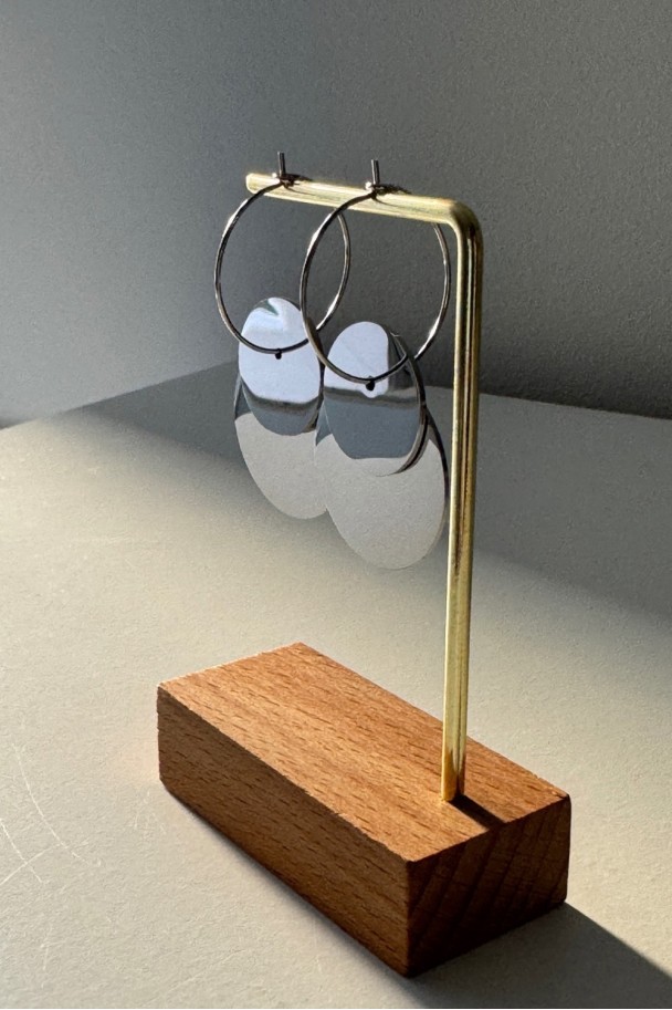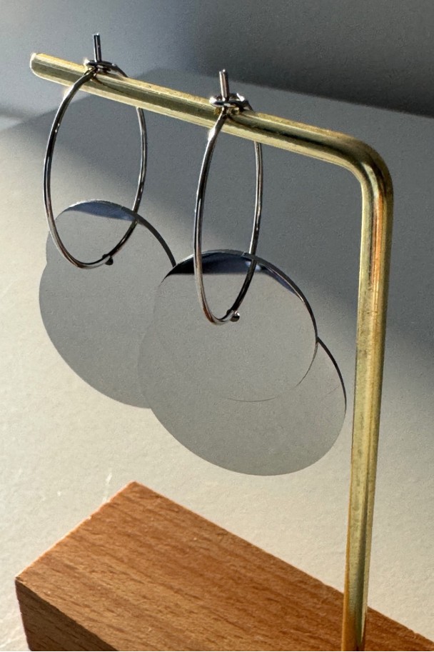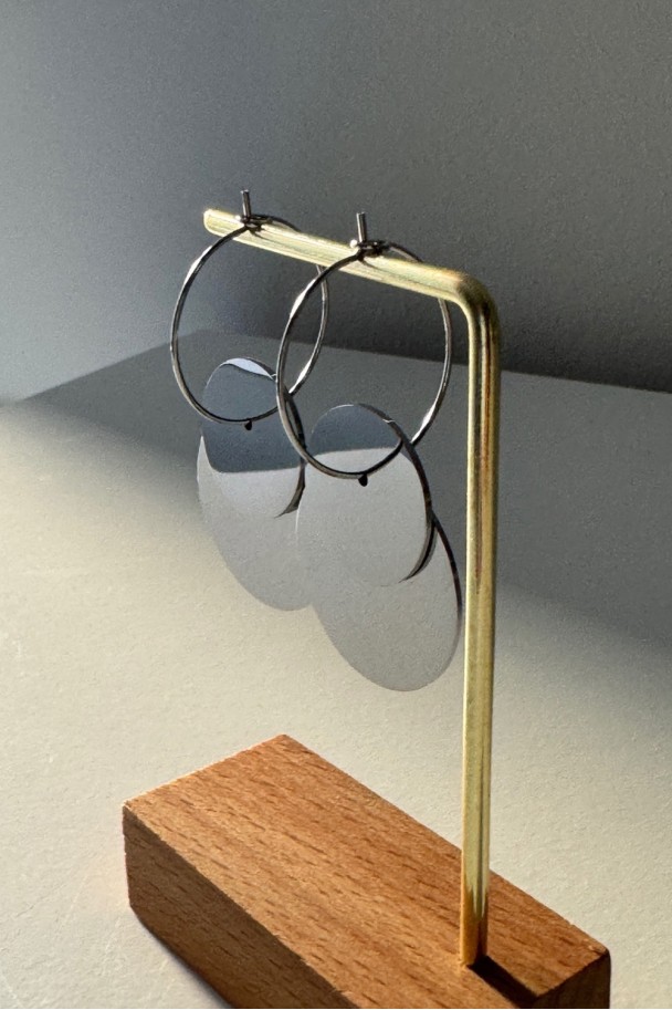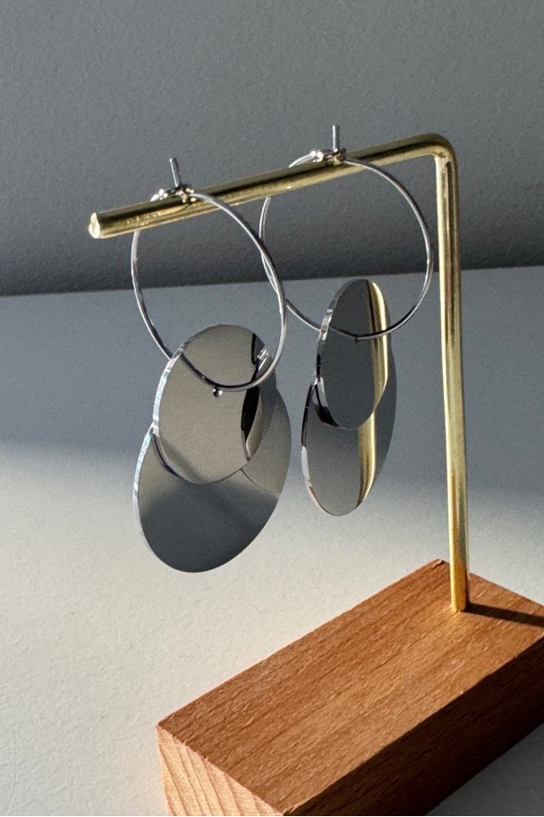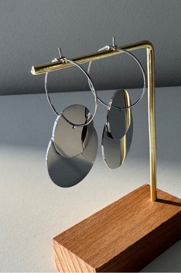 Estos pendientes largos de acero plateado, combinan un aro fino con dos piezas redondas pulidas que reflejan la luz de forma sutil y sofisticada. Su diseño moderno y ligero estiliza el rostro y aporta movimiento, convirtiéndolos en el accesorio perfecto tanto para looks diarios como para ocasiones especiales.