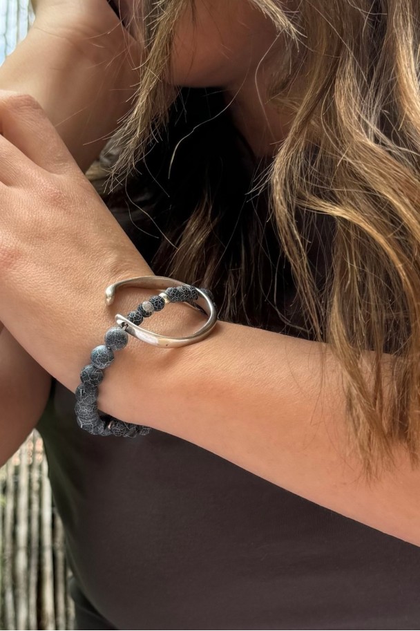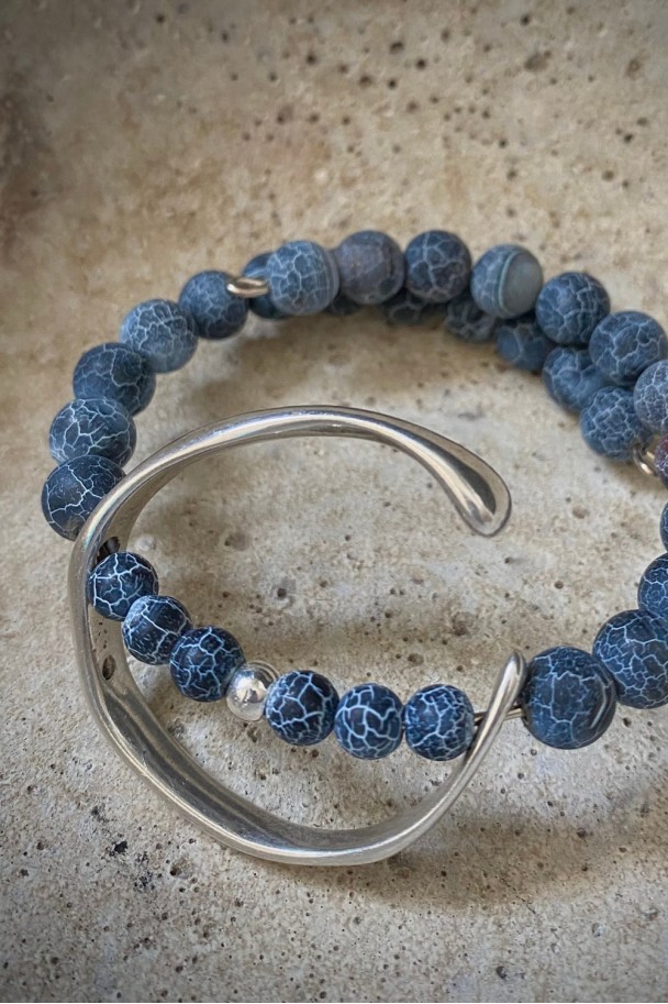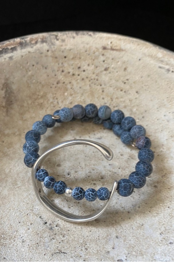 Descubre la belleza y distinción de nuestra pulsera de ágatas azules con dije en baño de plata. Su diseño exclusivo combina la profundidad del azul con delicadas líneas blancas que aportan un acabado único y sofisticado. Su pieza plateada añade un toque moderno y elegante a cualquier look.