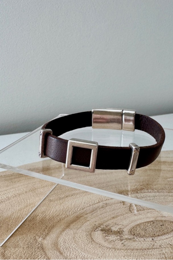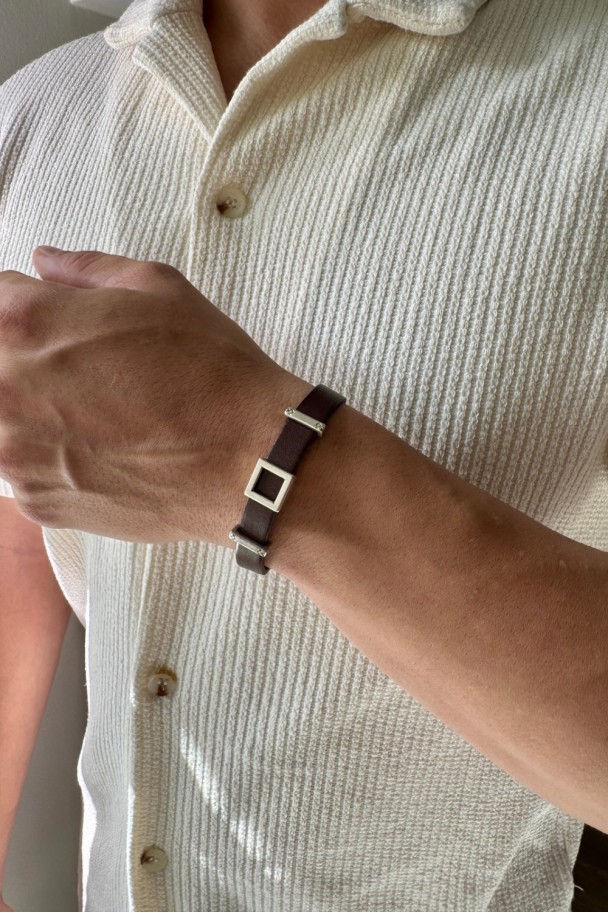 Descubre nuestra pulsera de cuero marrón oscuro con detalles metálicos bañados en plata, una pieza diseñada especialmente para el hombre actual que valora la elegancia discreta y el estilo con personalidad. Hecha a mano con materiales de alta calidad, esta pulsera combina la fuerza del cuero con el diseño geométrico del metal, creando un accesorio moderno, versátil y atemporal.